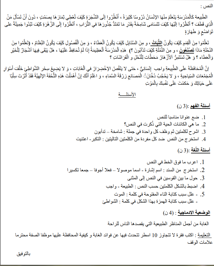 نموذج اختبار اللغة العربية 5 ابتدائي الفصل 3 نص التضامن نوافذنا التعليمية